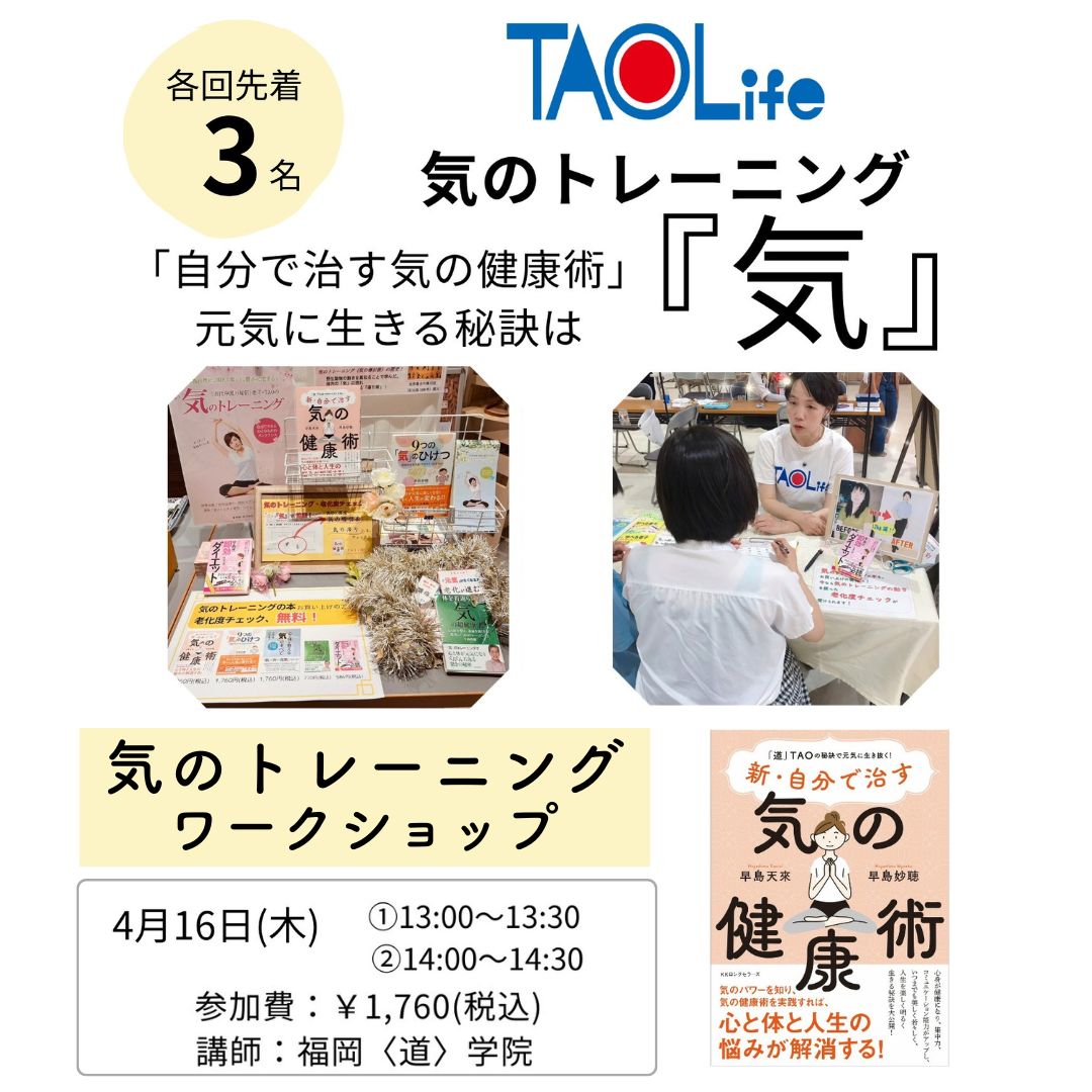 ぜひ、老子・道(TAO・タオイズム)のありのままの無為自然な生き方を身につけて、自分らしく、そして一流の人生を歩みたいという方は、まずはお気軽に「気のトレーニング・個別説明会」にご参加下さい。